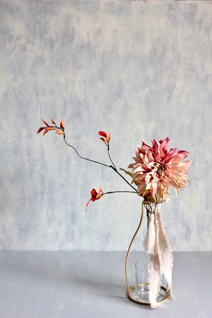 秋にピッタリなお花を閉じ込めた、アーティフィシャルフラワーとゴールドフラワーベースがセットになったシリーズです。