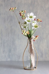 ミセルデコオリジナルのゴールドのワイヤーフレームが描く幾何学ラインの中に、透明感あるガラスカップと季節の造花をセット。