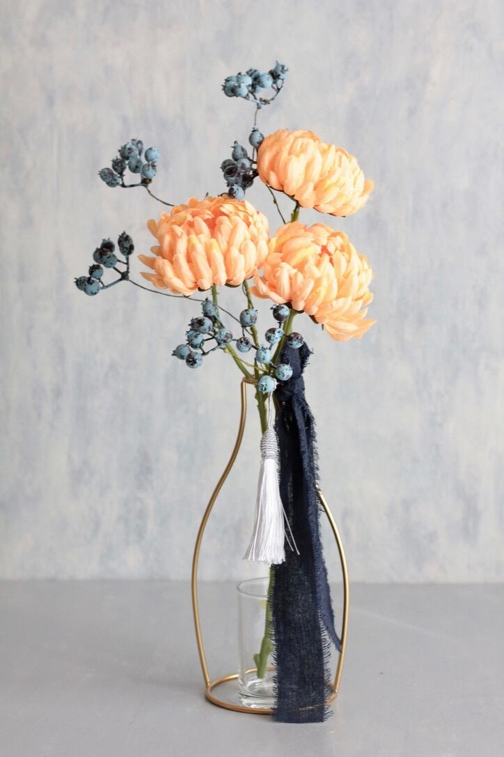 ミセルデコオリジナルのゴールドのワイヤーフレームが描く幾何学ラインの中に、透明感あるガラスカップと季節の造花をセット。