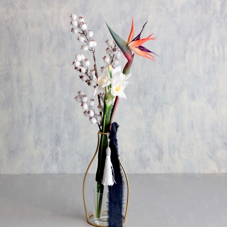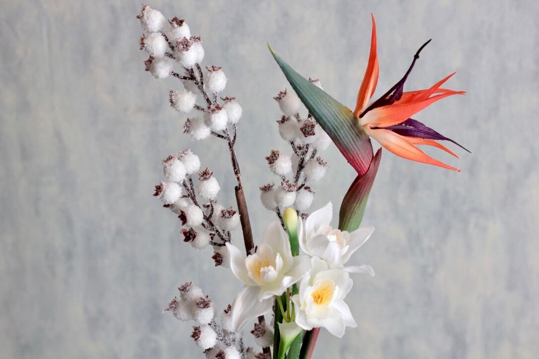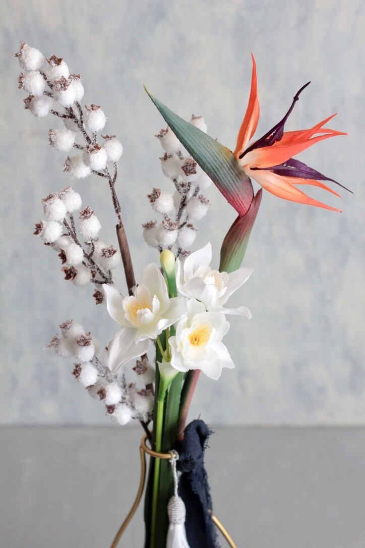 【ストレチア・スイセン・雪枝】|アーティフィシャルフラワー 花瓶アレンジ| 冬|ギフト・インテリア雑貨