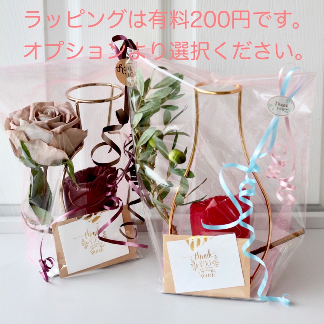 ギフトラッピングの場合もお花は曲げた状態でラッピングしております。(ギフトの場合は簡単な説明文を同封してます)
